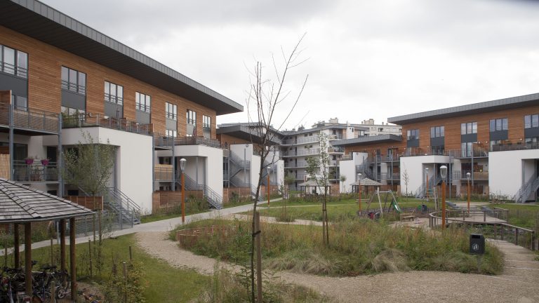 Bouw van 119 woningen verdeeld over 4 gebouwen op een gemeenschappelijke kelderverdieping. Gecentraliseerde ketelruimte met een warmtekrachtkoppelingsinstallatie. Groendak. Passieve of zeer lage energie woningen. De gemeenschappelijke tuin wordt gebaseerd op biodiversiteit.